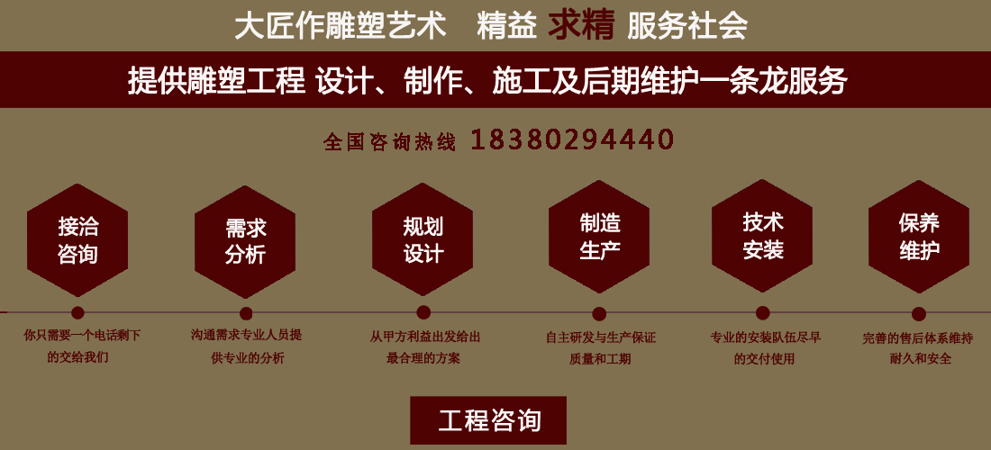 成都大匠作雕塑有限公司,是經(jīng)成都工商局審定注冊的正規(guī)專業(yè)雕塑制作及工程安裝服務機構,是由一群年輕富有朝氣的年輕人創(chuàng)辦,發(fā)軔于四川省成都市龍泉驛區(qū)。它是一家******于創(chuàng)作、制作和銷售為一體的公司。大匠作擁有多年從事公共藝術的專業(yè)人員和雕塑制作人組成的核心團隊,為您提供專業(yè)、具創(chuàng)新的設計及制作服務。公司成立以來,秉承“******服務、誠信為本”的宗旨,以客戶需求為目標導向,不斷學習,進取,優(yōu)化和提高服務質(zhì)量,公司向您******——“您的滿意***是我們的信譽”,我們將以飽滿的熱情和******的服務贏得您的贊譽和支持。 愛心,細心,耐心,責任心是我們的要求,盡心盡職,為您打造出創(chuàng)新、專業(yè)、******的設計方案,我們堅信先做人、后做事,用心對待客戶,實行透明收費,人性化服務,本著對客戶負責,對客戶負責,更是對自己發(fā)展負責的態(tài)度,爭取做到讓每位客戶滿意